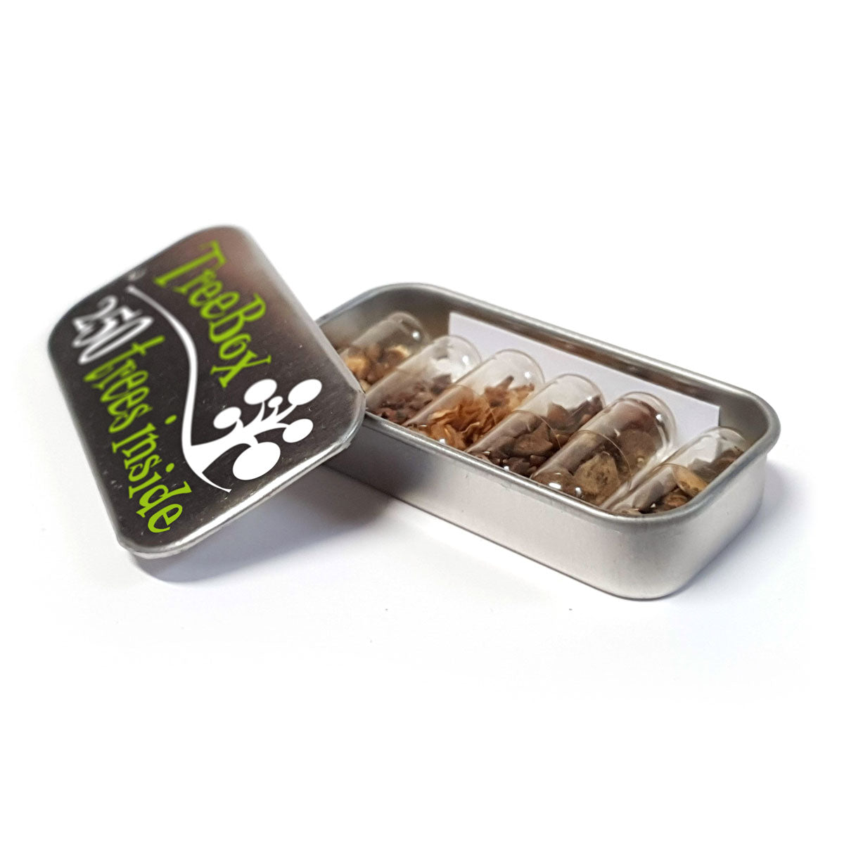 TreeBox – Maza kārbiņa ar sešu veidu koku sēklām. Katrā kārbiņā ir sēklas lai izaudzētu aptuveni 250 kokus.