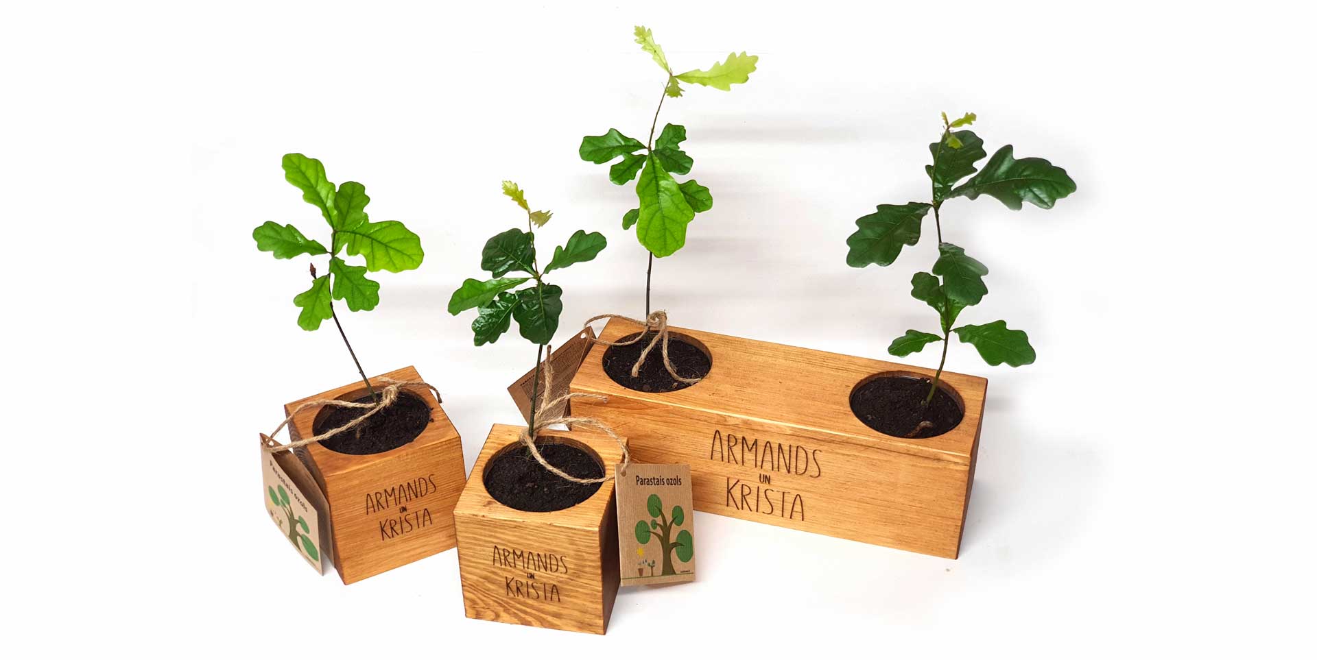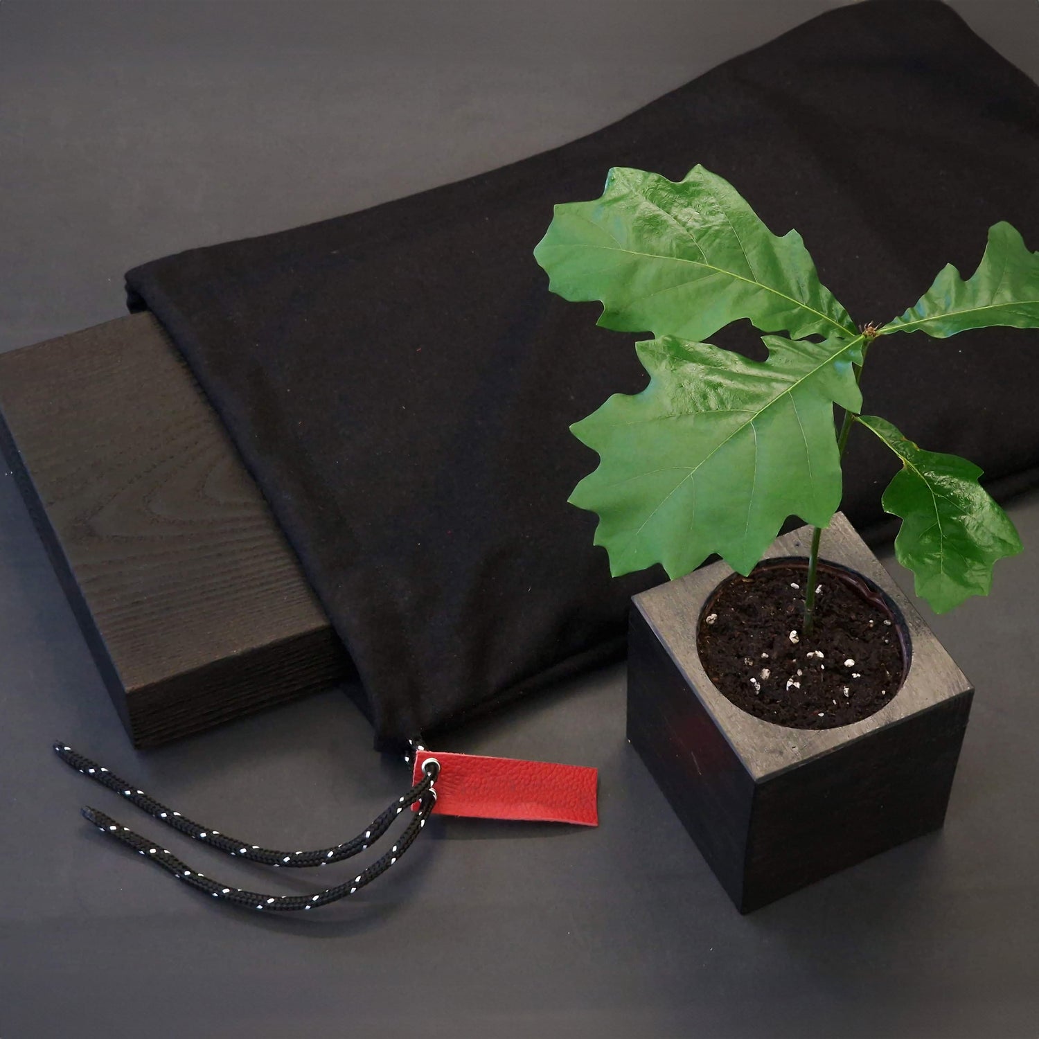 Lielākai dāvanai apvieno vairākus produktus. Šajā attēlā redzams cik iespaidīgi komplektā izskatās melna apdedzināta ozolkoka dēlītis vilnas maisiņā un nesen izdīdzis maziņš ozoliņš tādas pašas krāsas podiņā.