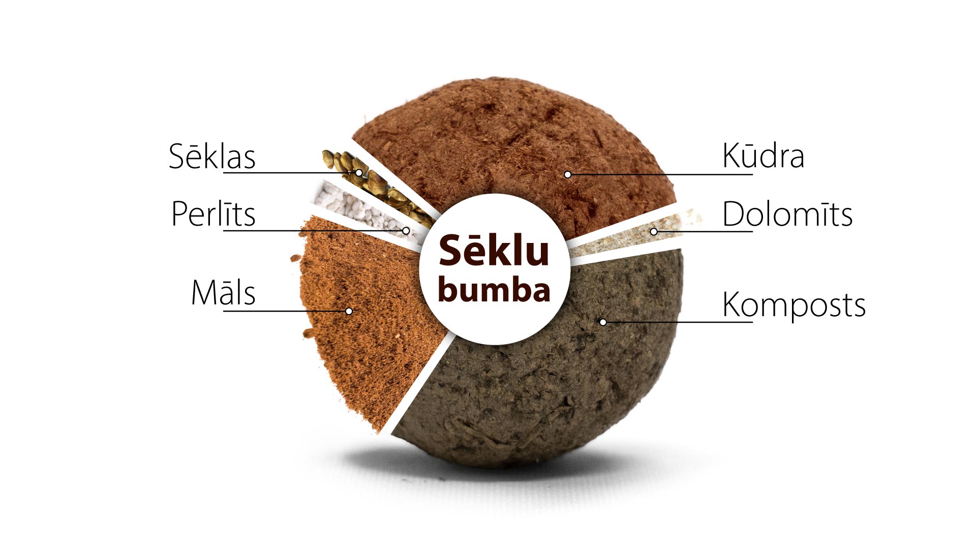 Sēklu bumbas izgatavojam tepat Latvijā. Tās satur minerālaugsnes un komposta kombināciju. Atkarībā no sēklu veida sēklas sajauc ar augsni pirms sēklu bumbiņu veidošanas vai arī atsevišķi ievieto mitrā sēklu kamolā. Mēs rūpīgi ar rokām saritinam katru sēklu bumbiņu, līdz tā ir perfekta. Pēc tam sēklu bumbiņas tiek žāvētas nodrošinot drošu patvērumu sēklām līdz to dīgšanai.