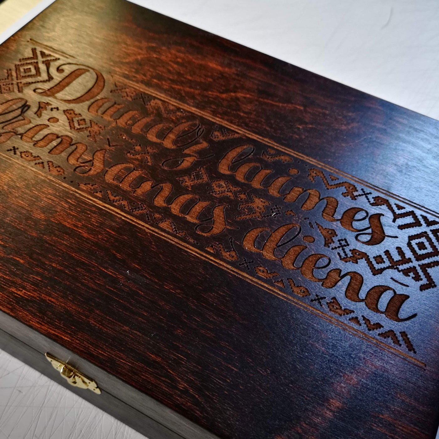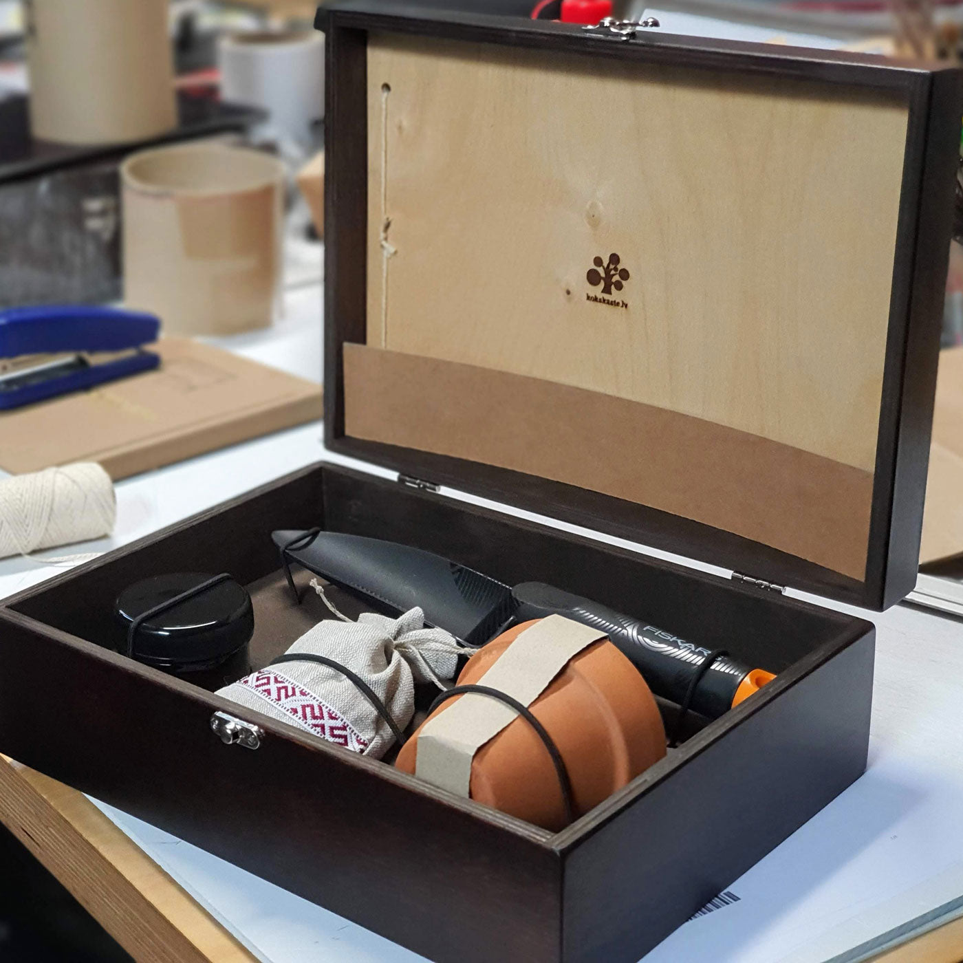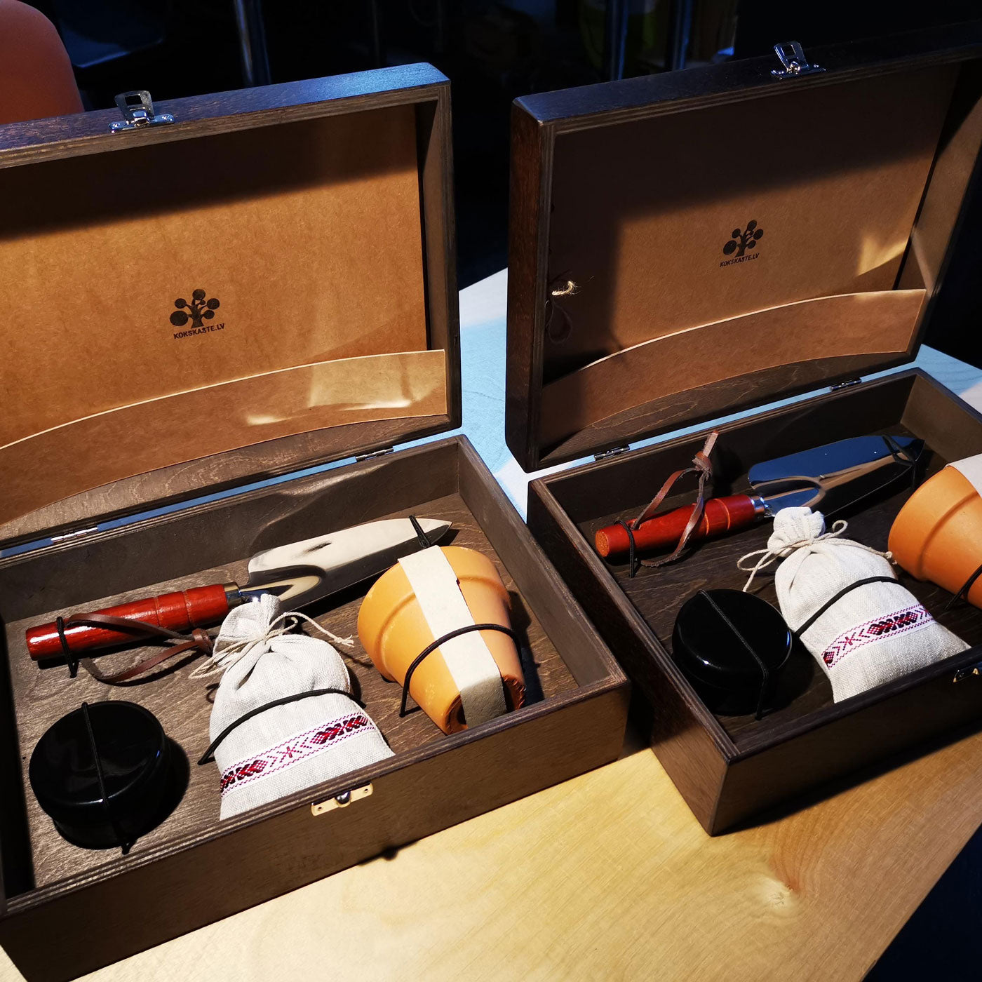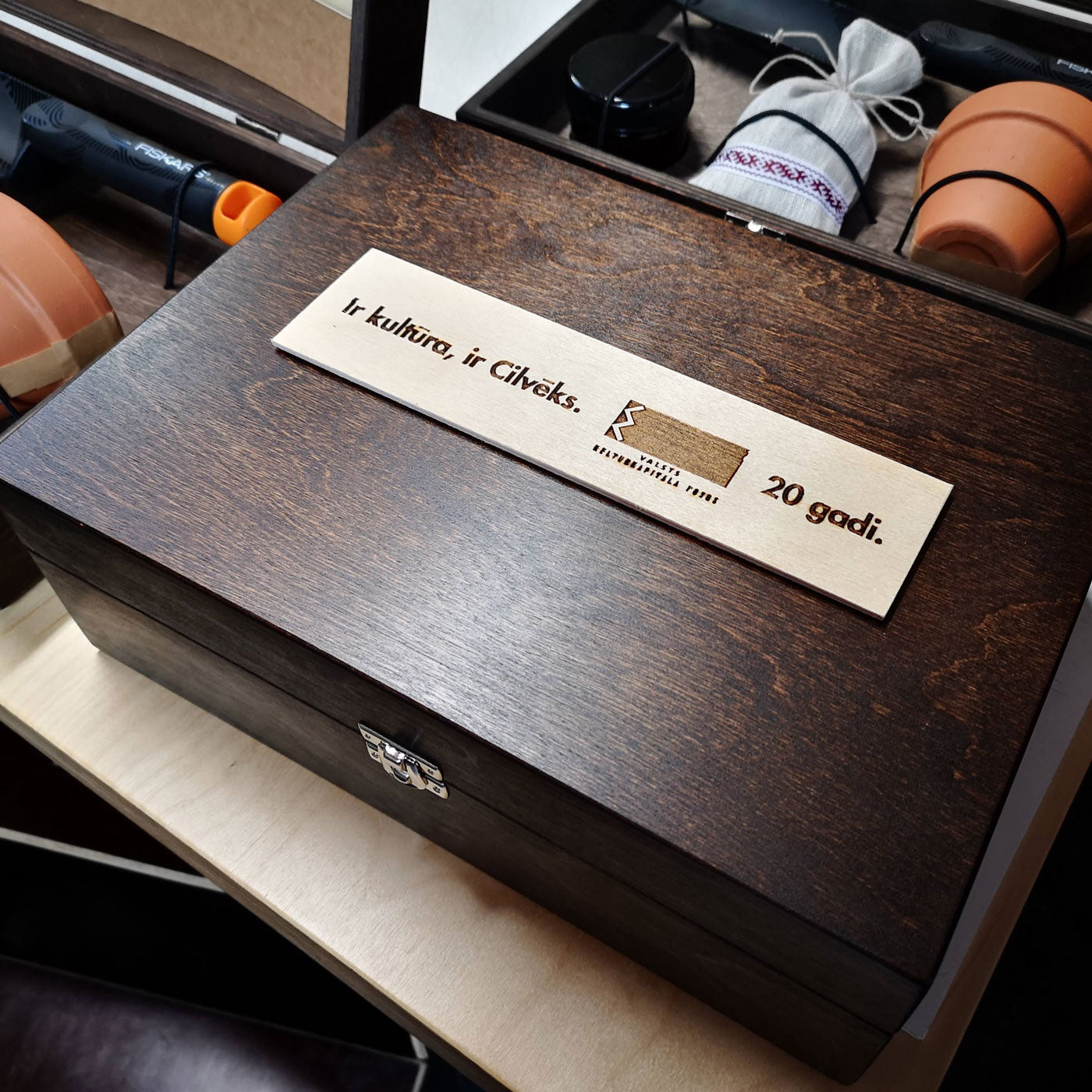 Kaste ir izgatavota no beicēta Latvijas finiera saplākšņa ar metāla enģēm un aizdari. Uz kastes vāka iespējama plāksnīte ar lāzergravējumu. Iespējams arī lāzergravējums uz māla podiņa.