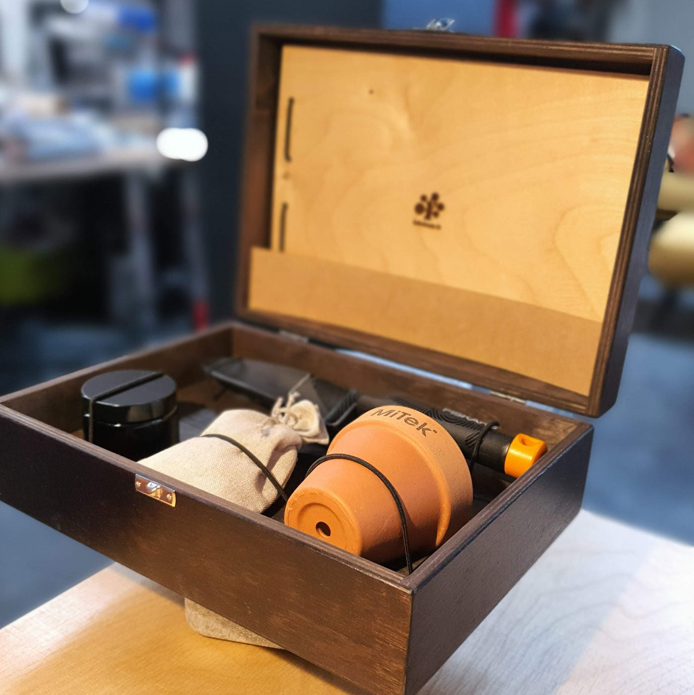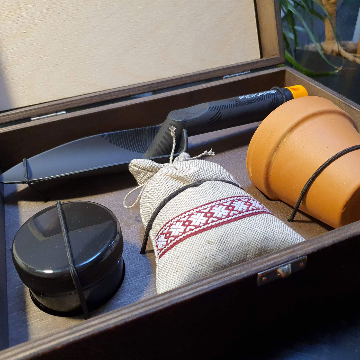Lielā kaste sastāv no: Koka kastes, sēklām, augsne lina maisiņā, māla podiņa un paliktnīša, lāpstiņas un pamācības.