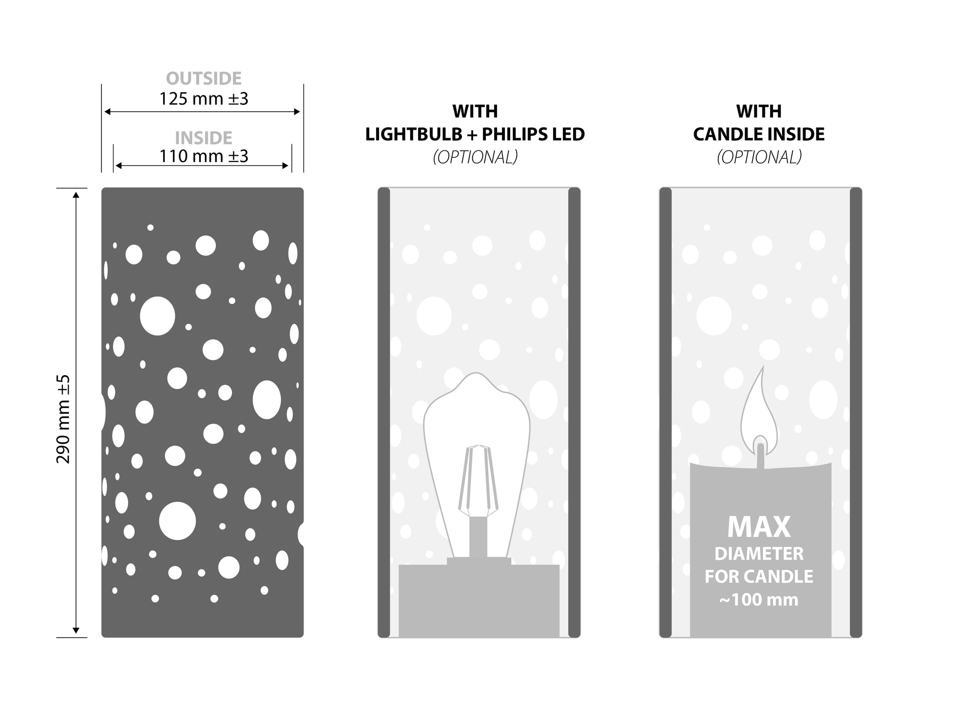 Laternas augstums ir ap 290mm, diametrs ap 125mm.